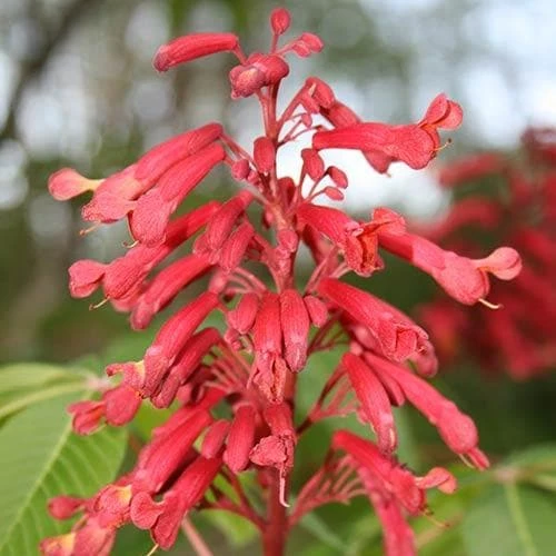 From the eastern United States, Aesculus pavia is a large, deciduous shrub of rounded, bushy habit, sometimes a small, conical tree. The glossy, deep green leaves are palmate (like a hand), as befits this relative of the horse chestnut, with 5-7 narrow leaflets, each 5”/13cm long. Long, upright panicles, 6”/15cm long, of crimson flowers, sometimes marked with yellow, are borne in June and July, and are good for bees. Clusters of light brown, smooth skinned fruits follow in autumn; be aware that these are inedible, even slightly toxic. Red buckeye is good as a lawn specimen in smaller gardens.