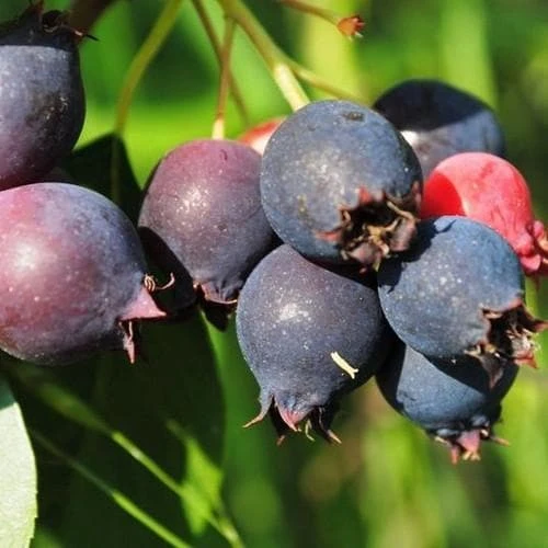 A large hardy, North American shrub with excellent blueberry-like fruits, the Russian bred variety Krasnojarskaja produces fruit that is a dark pink to blue color with a refreshing, sweet to slightly sour taste. This hardy shrub is both attractive and productive: white blossom covers the plant in May, followed by a good crop of edible berries in July. A compact and high-yielding variety of domestic selection. On average it yields 4kg of berries per year. Bee and wildlife friendly. Self fertile.