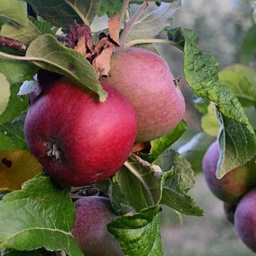One of the few apples that can be used for a single-varietal cider, Malus domestica Kingston Black was bred in Kingston, Somerset in the 19th century. The fruit is comparatively small, almost completely flushed a very deep maroon-red; it produces an aromatic, well-balanced, bitter-sharp juice with a lovely, distinctive flavour. The tree is a light, not always reliable, cropper, slow to come into bearing, and can be susceptible to scab and canker, but is nevertheless popular with cider-makers for its exceptionally high-quality juice. A spur-bearer, cider apple Kingston Black is good for pollinators.