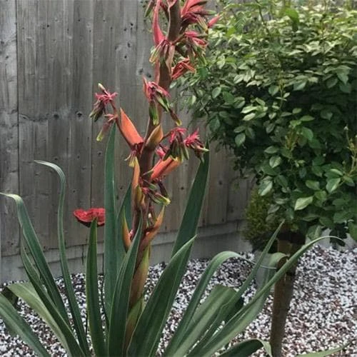 Only for the mildest areas, planted in the shelter of a warm wall, Beschorneria yuccoides Flamingo Glow is an exotic-looking perennial plant with rosettes of lance-shaped, yucca-like leaves, variegated in longitudinal stripes of yellow and grey green. In midsummer, mature plants produce bright pink stems up to 5’/1.5m tall with lime-green flowers within long carmine bracts. In colder areas, Beschorneria Flamingo Glow should be planted in cactus compost in a large container and brought into a frost-free greenhouse for the winter.