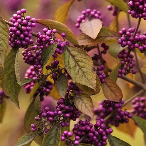 This selected form is very free fruiting, with conspicuous clusters of bright violet berries in Autumn. Small pale pink flowers in midsummer. The young foliage is bronze-purple, and makes good material for vases, as do bare branches laden with berries. The Royal Horticultural Society has given it its prestigious Award of Garden Merit AGM. If required, prune in early spring.