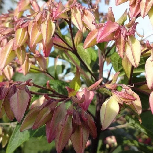 A small spreading tree or large shrub with scented foliage. Pink or greenish buds open into clusters of fragrant white flowers in summer. Striking blue berries with red calyces follow in autumn. Reasonably frost hardy but will need a sheltered position in areas with cold winters.