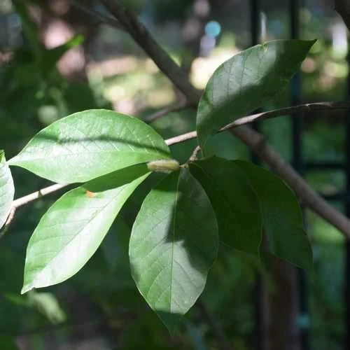 Believed to be a hybrid between Magnolia salicifolia and Magnolia kobus, bred in Japan, the willow-leaved magnolia, Magnolia x kewensis Wada’s Memory is a small, graceful, slow-growing, deciduous tree, conical when young, but developing a broad crown as it matures. Scented, semi-double white flowers appear in mid-spring on the bare branches. The big, oval leaves emerge reddish, turning bronze and then green. Bright pink knobbly fruits containing orange-red seeds form in autumn. Very little pruning required; prune in late summer to prevent ‘bleeding’. Holds the RHS Award of Garden Merit.