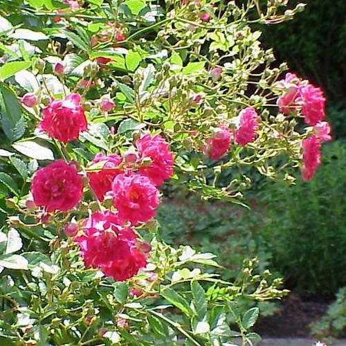 An old favourite rambling rose with lots of clusters of small crimson double flowers. A long flowering season, then occasional repeats. Very vigorous, Rosa Excelsa will grow to approx 15ft.