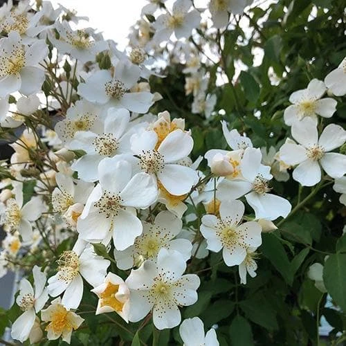 Discovered by and named for the famous plantsman, artist and gardener, Rosa Sir Cedric Morris is a very large, vigorous, thorny, deciduous rose with long, lax stems and beautiful, divided leaves flushed with purplish-grey, a legacy from its Rosa glauca parent. Like most ramblers, it flowers magnificently in midsummer, but does not repeat. Huge clusters of small, single, creamy-white flowers with golden stamens and a gentle scent are borne in midsummer, making a breath-taking spectacle. The flowers, which are attractive to bees, are followed by bright orange-red hips in autumn, giving a second season of interest. Rambler rose Sir Cedric Morris is a tough, hardy rose, particularly good trained over a pergola or up a tree with a late-flowering viticella-type clematis, which will flower when the rose has gone over. Because its stems are lax, it is easy to train.