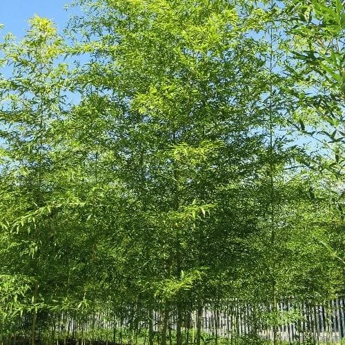 A tall, elegant bamboo, Semiarundinaria fastuosa f. Viridis has a narrow, very upright but spreading habit; the roots may need to be confined within a bamboo root-barrier. It’s a wonderfully architectural, fast growing bamboo with beautiful green culms (canes) and lush, deep green, evergreen leaves, up to 10”/20cm in length, giving an exotic, tropical look. Bamboos are heavy feeders, so give an annual mulch of manure or compost. Prune out straggly culms and lower leaves of green temple bamboo in early summer for a smart, architectural appearance. Needs shelter from cold, drying winds.