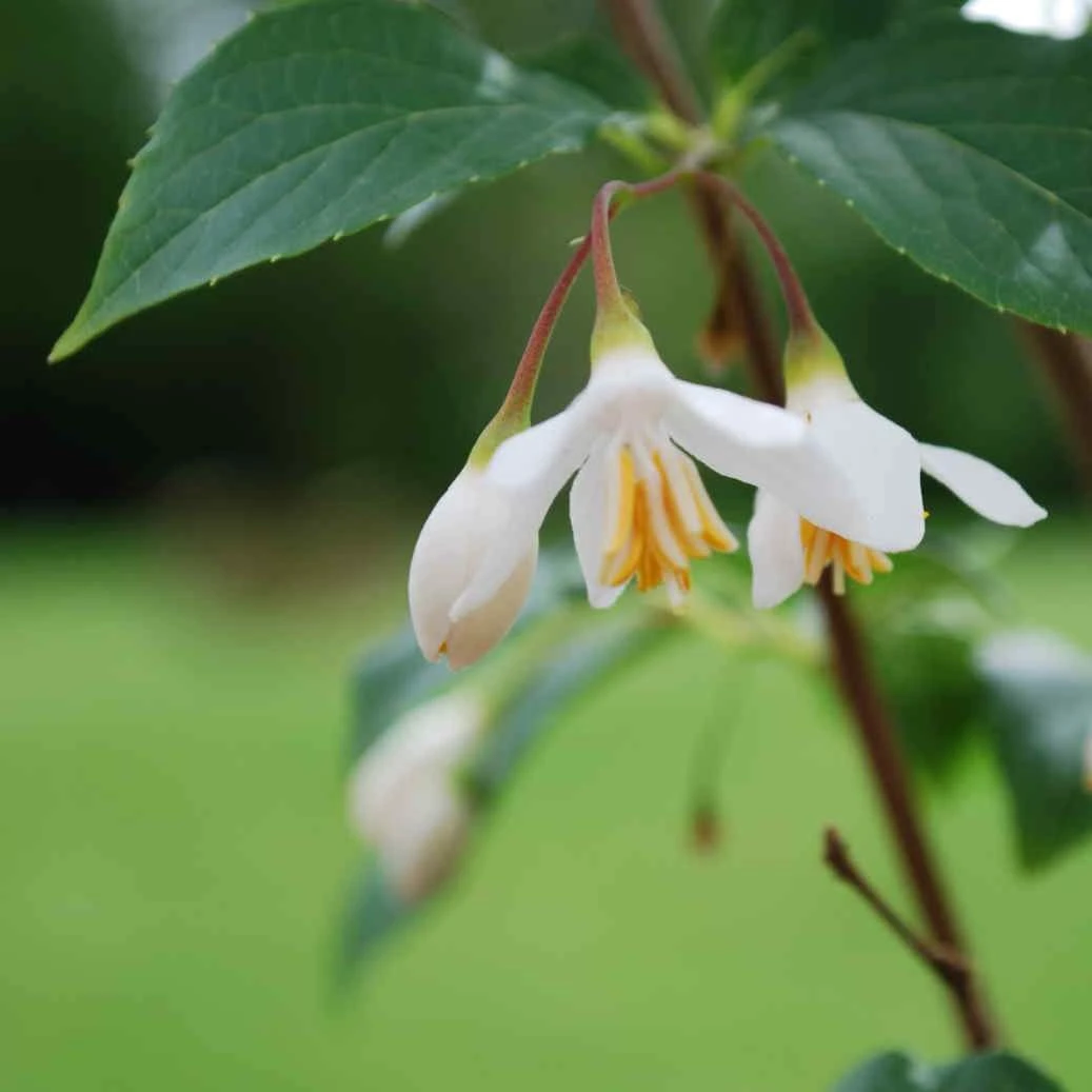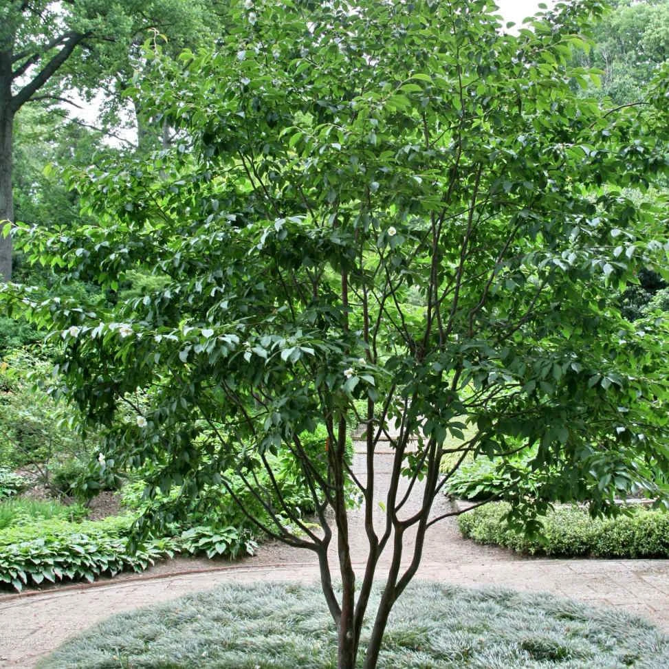 Related to camellias (and our own domestic tea), Stewartia sinensis is a small to medium-sized, deciduous tree with a spreading, open habit, grown for its bark, flowers and autumn colour. The bark is exceptionally beautiful, ‘as smooth as alabaster and the colour of weathered sandstone’, according to Kew curator William Bean, ‘It turns purple, later brown, then peels away in translucent scrolls, exposing the fresh [sand-coloured] inner coating.’ The ovate leaves are deep green, turning reddish-purple in autumn. Single, pure-white, camellia-like flowers with a prominent boss of golden-yellow stamens, very attractive to bees, are borne in midsummer. Chinese stewartia makes a lovely specimen, giving year-round interest. Like all stewartias, it dislikes disturbance.